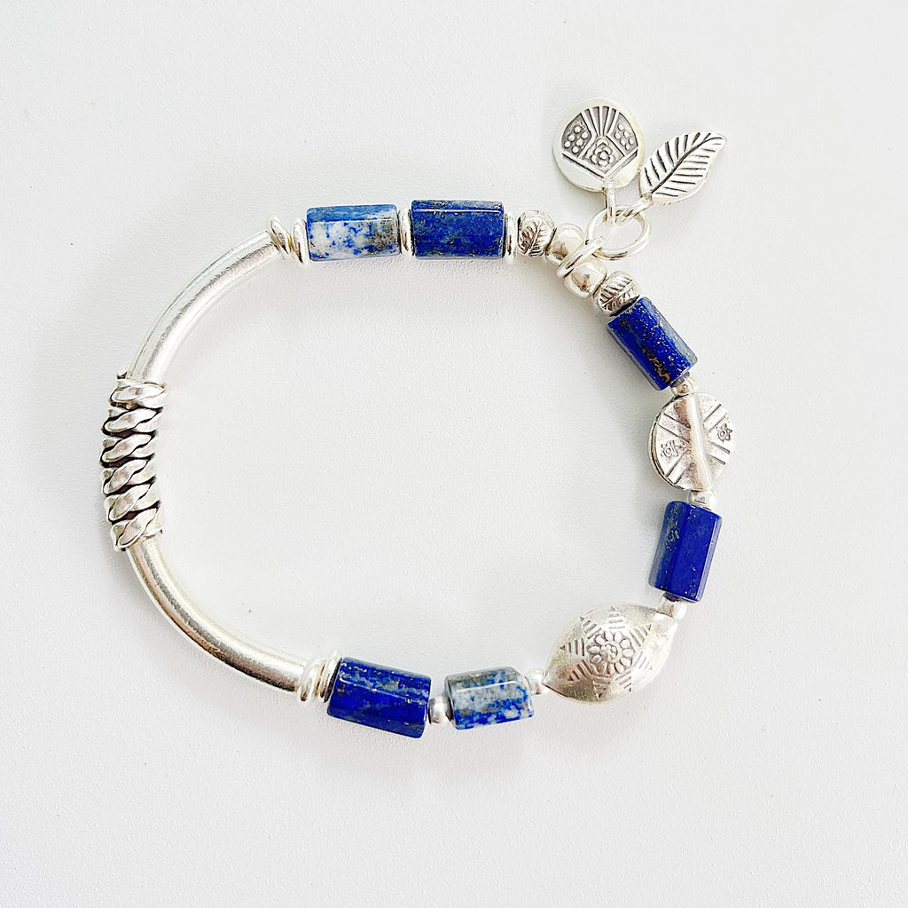 A beautiful Hill Tribe Silver bracelet with hand etched silver beads and stunning Lapis Lazuli gemstones.