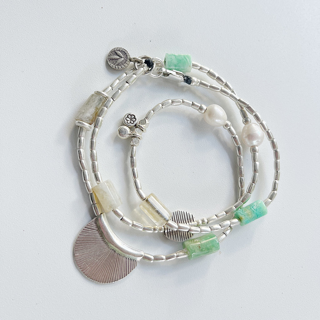 Stunning Citrine and Chrysoprase gemstone three strand wrap Bracelet with crescent moon.