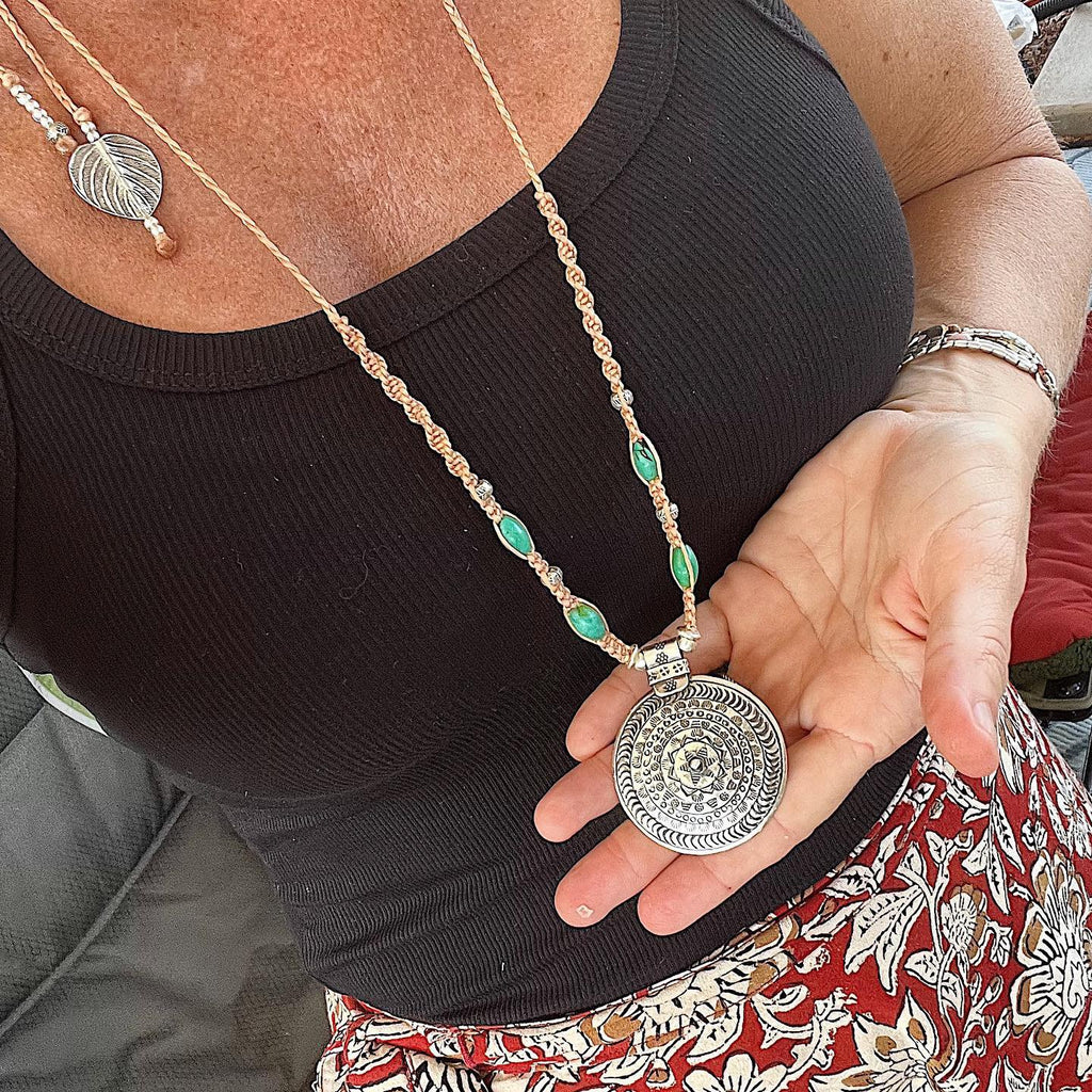 A beautiful macrame hand loomed necklace with a large hand etched Hill Tribe Silver pendant measuring approx 43mm round.